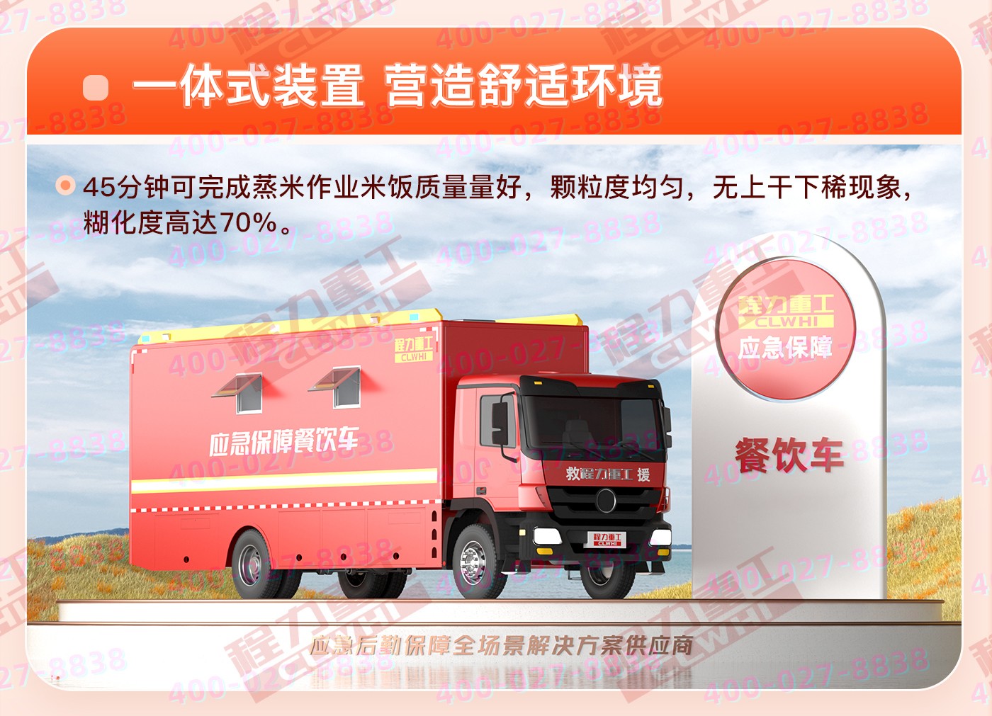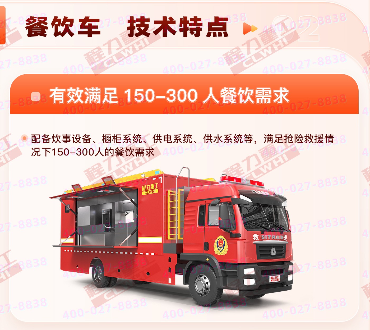重汽汕德卡飲食保障車集爐、櫥、箱、案與一體,緊湊靈巧;實現(xiàn)了衛(wèi)生、健康、環(huán)保的要求; 功能性等集合為一體。車廂可兩邊展開作為打餐窗口;車廂內飾為不銹鋼,配備不銹鋼爬梯、護欄、凈水箱,污水箱,雙眼灶,蒸飯車,冰箱等。不銹鋼整體壁柜,工作臺,發(fā)電機,空調等。該車機動性能好,專業(yè)性強,自動化程度高,自然環(huán)境適應性強,并能在駐車和行車時進行炊事作業(yè),可保障執(zhí)行野外任務部隊的飲食和飲水供應。