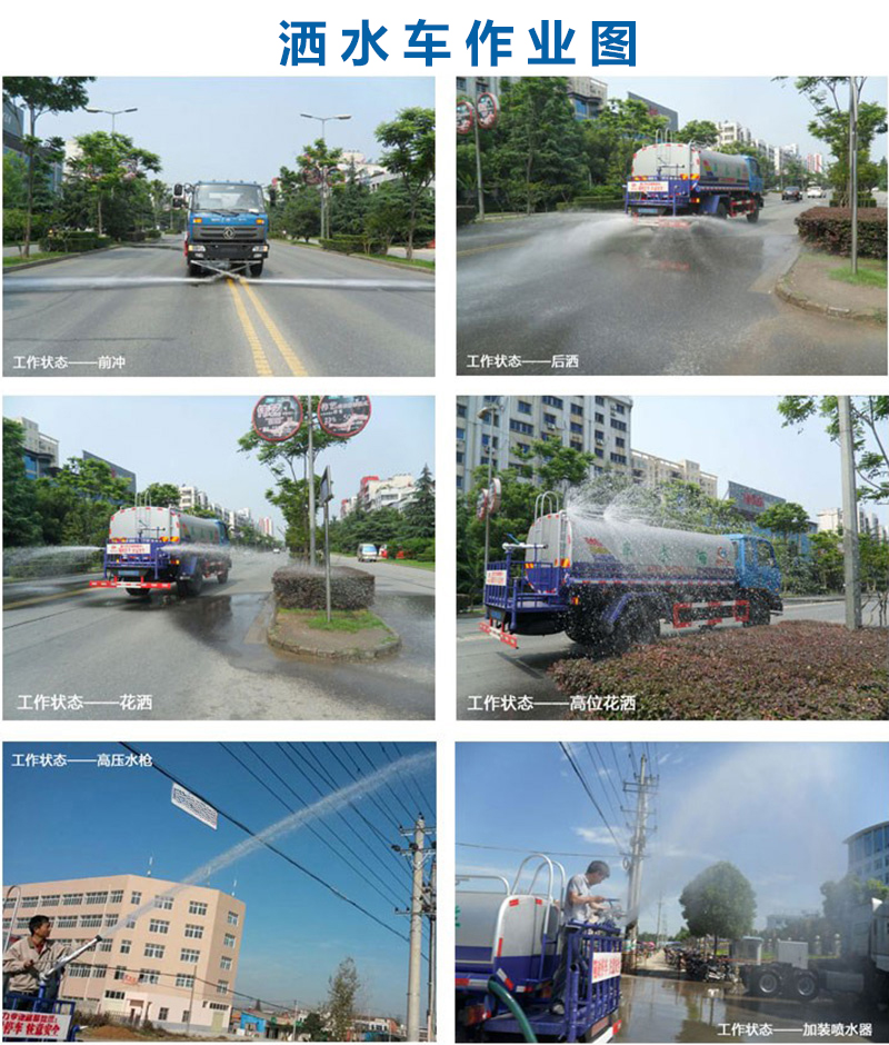 灑水車專用功能: 垂直吸程>6米,灑水寬度>14米,射程>28米。灑水車前沖(能將路面泥巴、塵土、垃圾沖干凈);后灑(能均勻地將水灑在路 面,一次灑水寬度>14米)、前側(cè)噴(花灑)(能均勻地將路旁綠化帶澆灌)、帶后工作平臺,平臺上安裝綠化灑水高炮(炮有大雨、中雨、毛毛雨、霧狀 可調(diào)節(jié))。配備全國質(zhì)量領(lǐng)先的大功率專用灑水泵,引水時間 <5分鐘,流量 90立方/小時 。 帶消防接頭,帶自流閥,帶自吸功能。