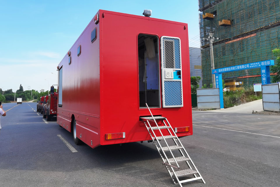 1、整車擴展艙為更衣間,更衣間右外側(cè)設(shè)有門和門梯,撤收后門梯固定在主車廂下副梁中間,更衣間門口處設(shè)有門梯燈;廂體后端設(shè)有登頂梯,主車廂下設(shè)有擴展機構(gòu),擴展艙(更衣間)的展開和撤收由擴展機構(gòu)實現(xiàn),撤收后有可靠的鎖緊機構(gòu)。設(shè)備間在廂體前端:內(nèi)部有燃油熱水鍋爐、2.8KVA柴油發(fā)電機、水泵、精密過濾器、暖風(fēng)機、滅火器、通風(fēng)窗、照明燈;淋浴間設(shè)置12個淋浴噴頭、U形不銹鋼水箱(淋浴間前端、右端、后端設(shè)置水箱)、皂盒、通風(fēng)窗、照明燈;更衣間為右側(cè)擴展艙,內(nèi)設(shè)有更衣柜、衣帽鉤、照明燈、前端下部設(shè)有通風(fēng)進氣門、后端上部設(shè)有換氣扇。